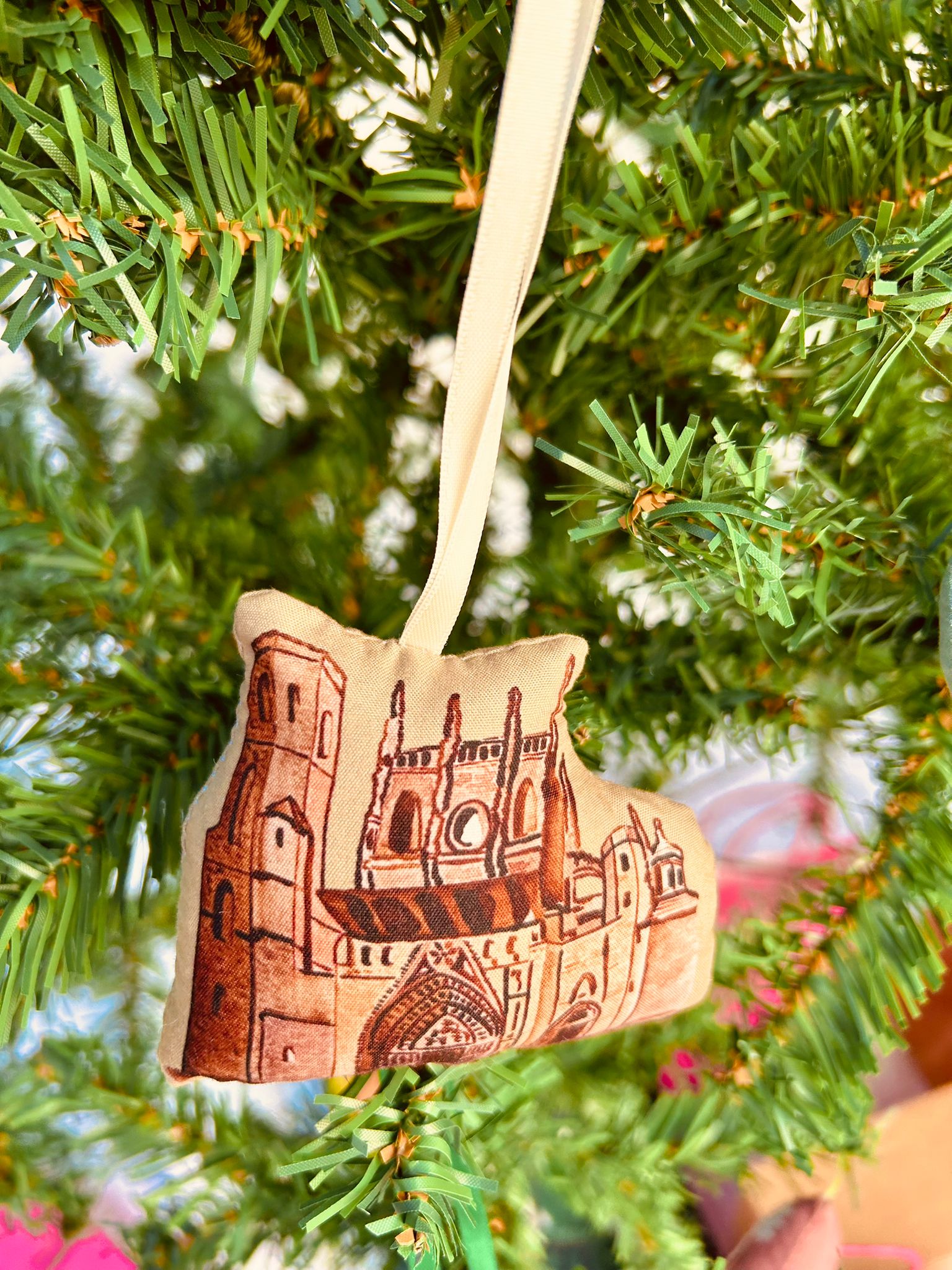 Adorno de Navidad de la Catedral de Huesca. Todos los adornos están diseñados y fabricados artesanalmente en Huesca, con popelín estampado y rellenos de guata.