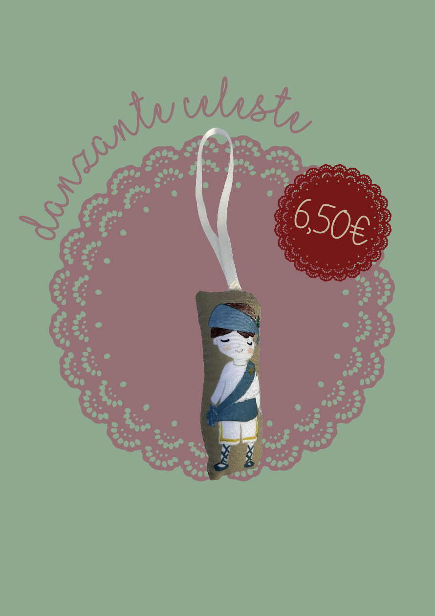 Adorno de Navidad de un danzante vestido de azul celeste. Todos los adornos están diseñados y fabricados artesanalmente en Huesca, con popelín estampado y rellenos de guata.