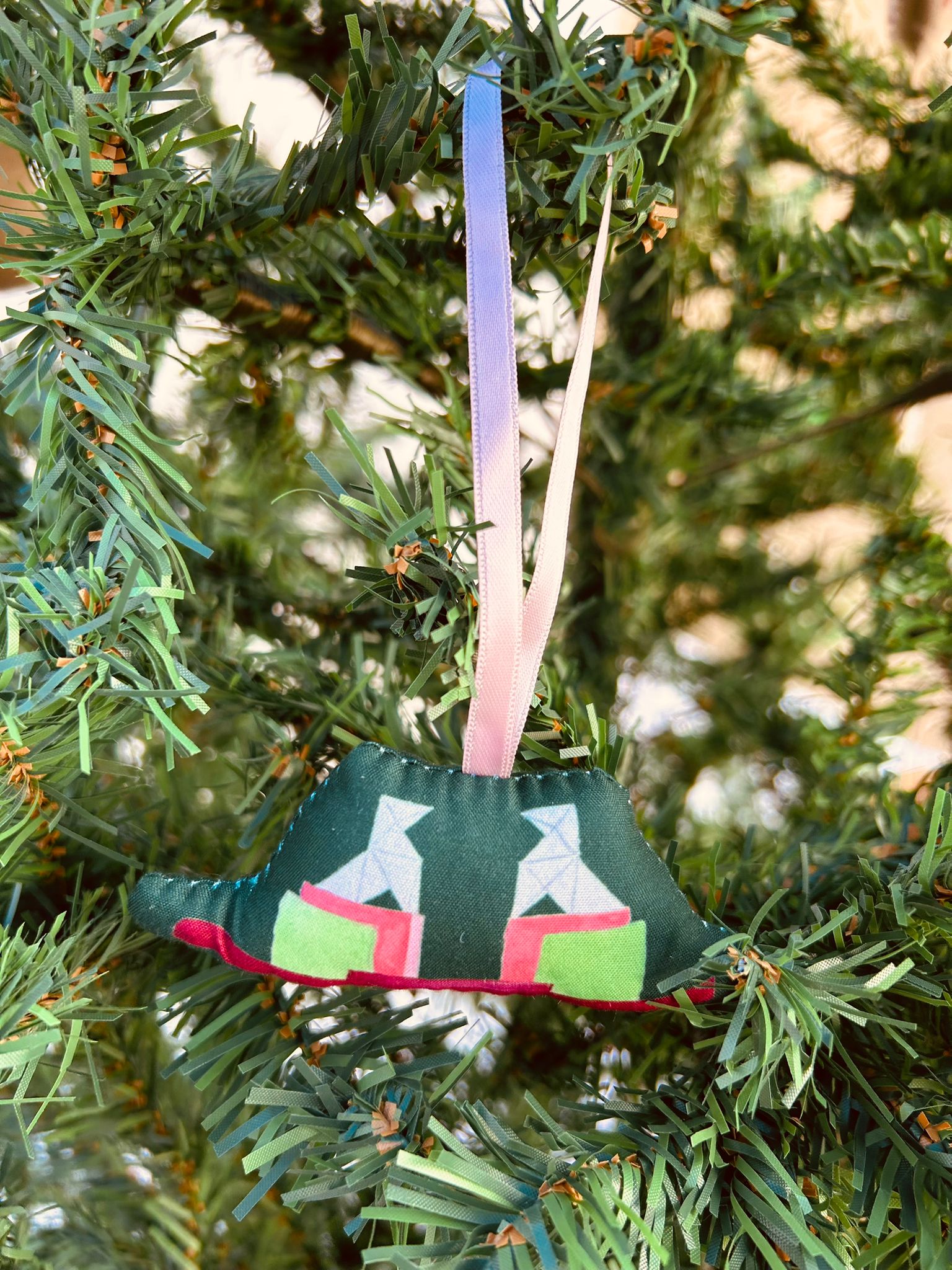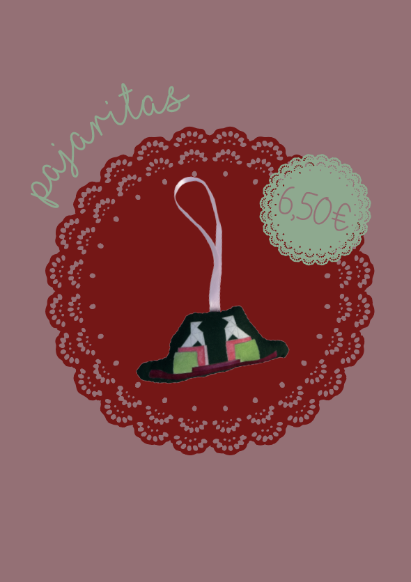 Adorno de Navidad de las pajaritas de Huesca. Todos los adornos están diseñados y fabricados artesanalmente en Huesca, con popelín estampado y rellenos de guata.