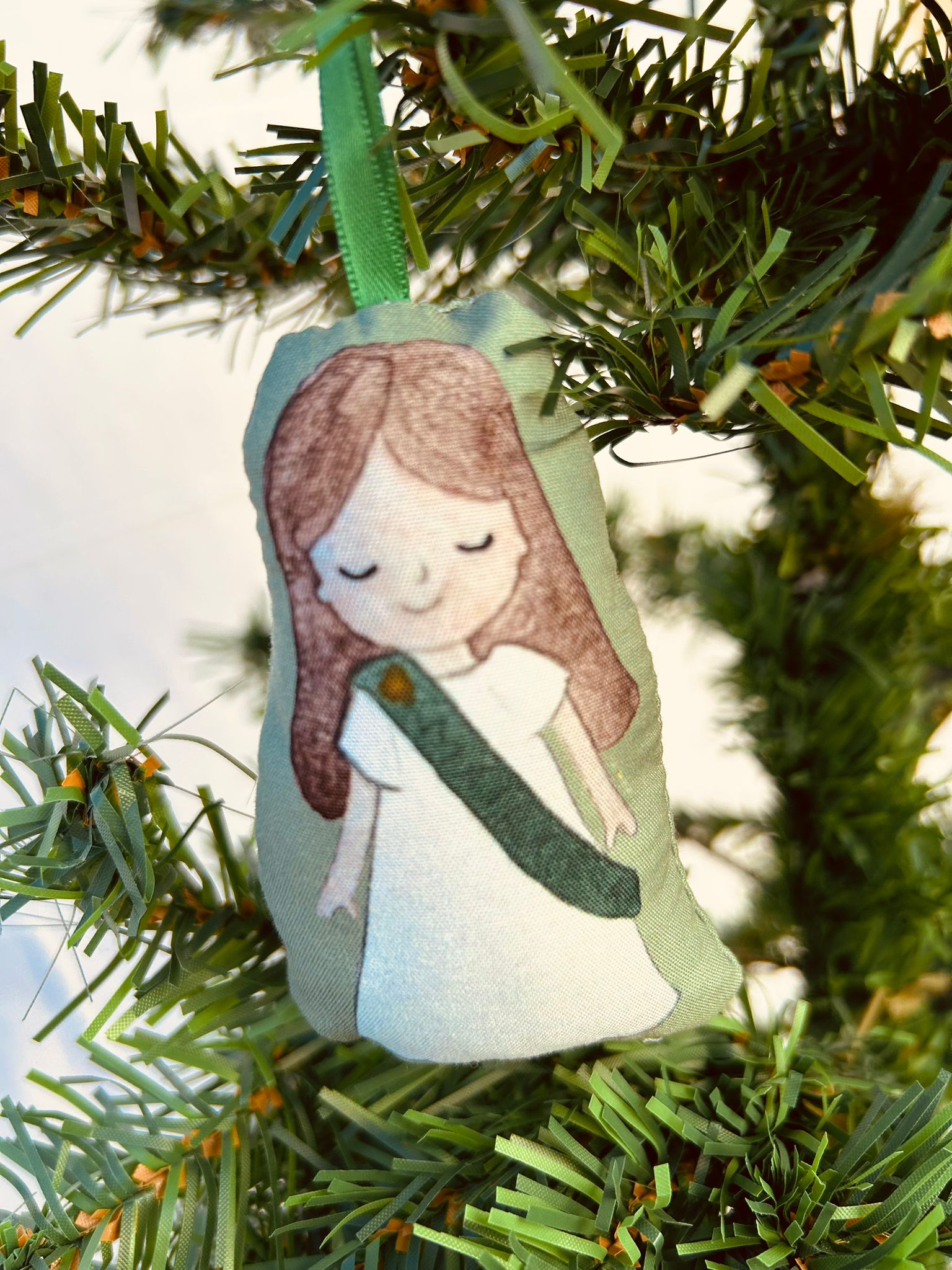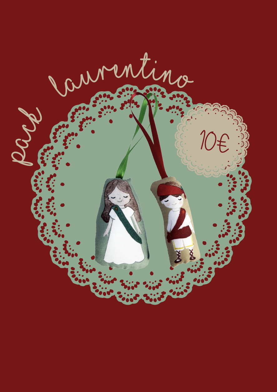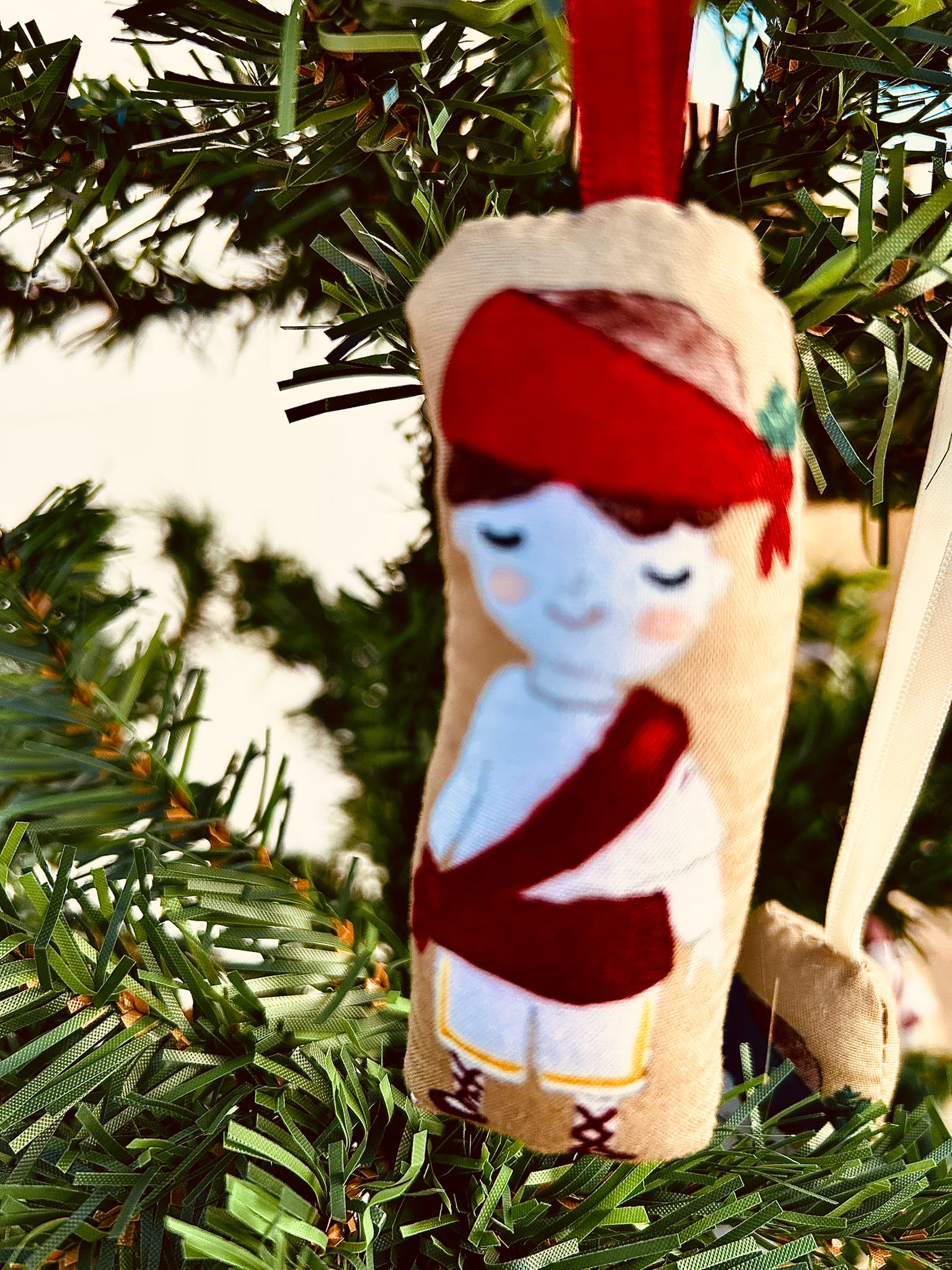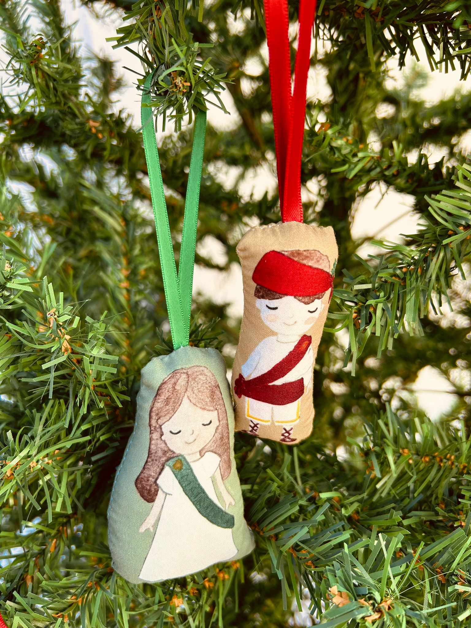 Pack de 2 adornos navideños compuesto por un danzante rojo y una Mairalesa. Todos los adornos están diseñados y fabricados artesanalmente en Huesca, con popelín estampado y rellenos de guata.