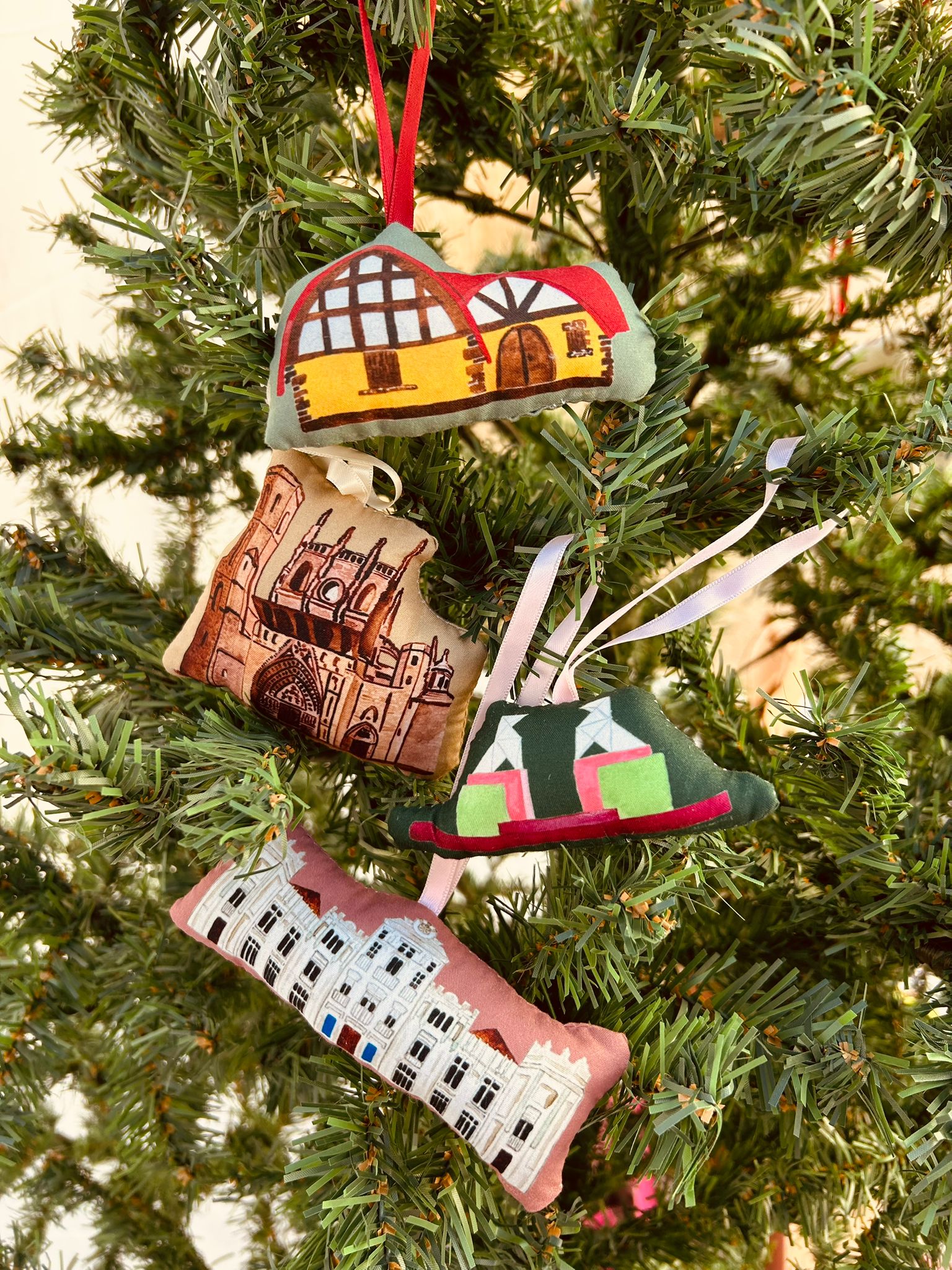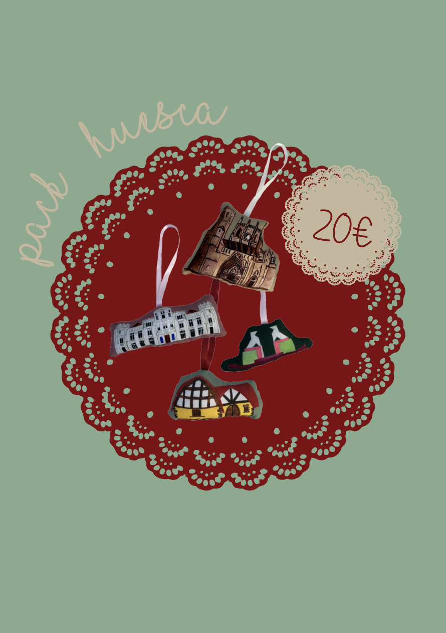 Pack de 4 adornos navideños compuesto por la catedral, la casita de Blancanieves, las pajaritas y el casino. Todos los adornos están diseñados y fabricados artesanalmente en Huesca, con popelín estampado y rellenos de guata.